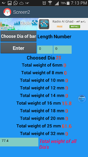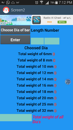 Calculate the weight of steel bars of different length and diameter , each length of each diameter can be entered and the app will sum the total weight of each diam , also the sum of total weight of all diameters .