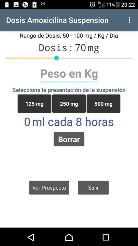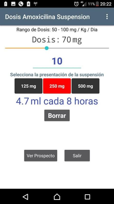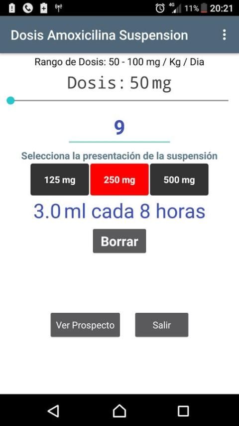 This is an application that provides the administration of amoxicillin suspension in different presentations (125 mg, 250 mg) using as dose range from 50 to 100 mg per kg body weight in 24 hours in 3 divided doses every 8 hours .