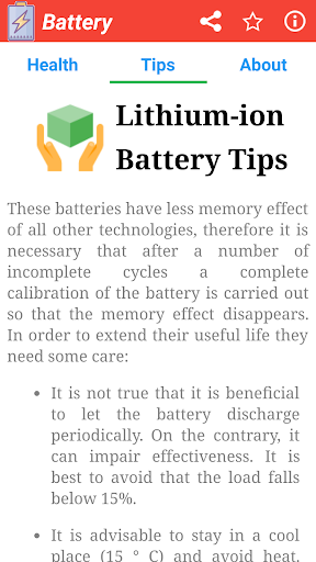 With this application you will be able to verify besides the health of the battery the level of load, the temperarura, the current voltage and others parameters. Also this app gives you a set of tips in order to keep the battery in good conditions.