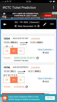 Find train between station, train enquiry, check indian railways berth availability and get confirmation chances for waiting list tickets for general and tatkal quota. If seats are not available, this app will suggest alternate trains to book confirm ticket. Check availability for 4 months in a view with seat availability calendar along with train fare for irctc.