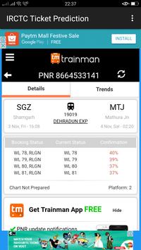 PNR enquiry facility with pnr prediction for wait-listed tickets. The app automatically fetches PNR numbers from irctc pnr sms and saves it to my trip list. It also checks PNR status in background from time to time and sends notification to user on any change. It offers other features like refund schedule for tickets booked under indian railways.