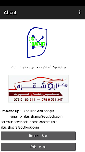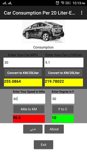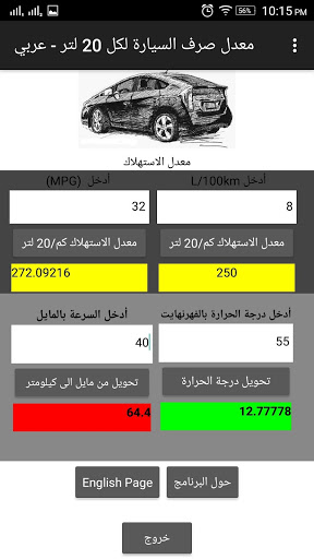 Easy to Convert AVG (average mile per gallon) to km per 20 liter Easy to Mile to km Easy to Convert F to C Easy to Convert Liter per 100km to km per 20 liter and there is Arabic page