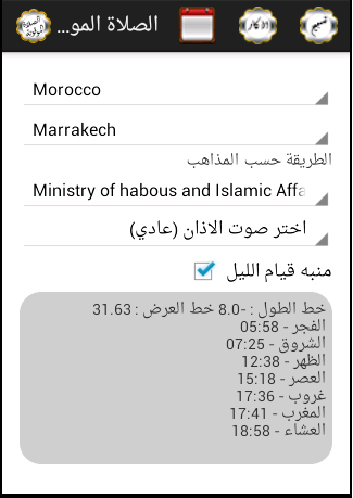 Salaat Timer (Salaat Mawqouta Assalat Almawqouta الصلاة الموقوتة) allows for the prayers with location data for each city in the world. The application provides the schedules according to the calculation method of the Ministry of Habous and Islamic Affairs of Morocco in addition to other organizations.