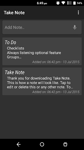 Take Note is an application that allows quick and easy note taking. Take Note connects to no online databases so you can be sure that your information is secure and loading of your notes are quick.
