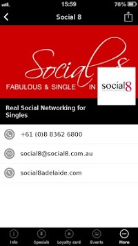 Social 8 is Adelaide's leading social club for single and fabulous people aged 25-mid 70's. Meet new people, make new friends, date and/or falling in love. Hundreds of dinners for 6 and events ensuring your social life is happening and fabulous.