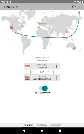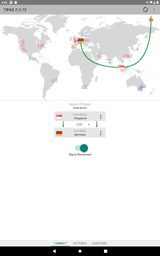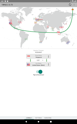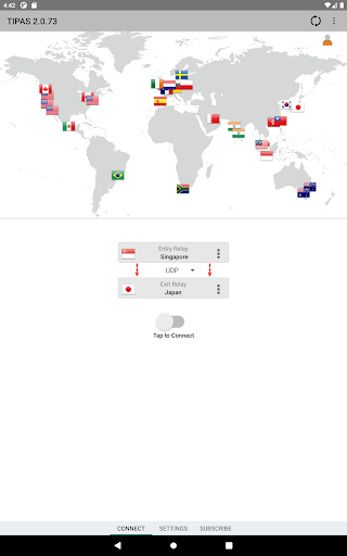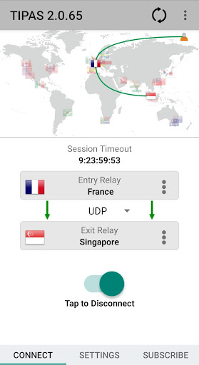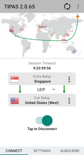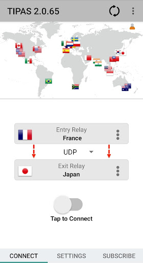 Tipas uses two separate relays to route your network traffic once VPN is connected. The entry relay above knows your IP address, but not your destination IP address. The exit relay below knows your destination IP address, but not your IP address.