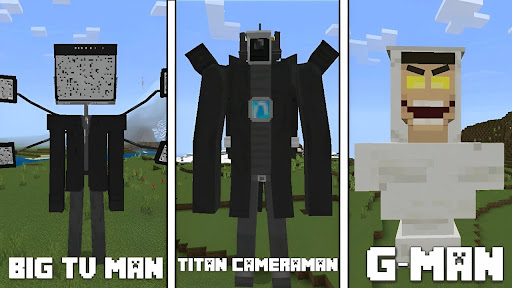 Skibidi Mod for Minecraft Pocket Edition adds Titan TVman and Camera man fighting to epic MCPE world. You can use skin of characters or other NPC to fight, craft and explore world of cubes and pixels.