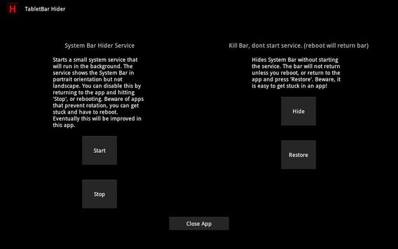 Please download the free demo before buying! The demo does not allow you to exit the app with the system bar hidden, but does verify that the app will be able to hide and restore the system bar properly.