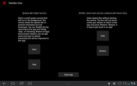 Tired of the Honeycomb System Bar getting in the way? This app allows rooted users to hide the Tablet System/Status Bar when in landscape orientation! Need access to the home or back keys? Just rotate the tablet to portrait, and the system bar is magically displayed. When you're done, just rotate the tablet back to landscape and the system bar is hidden again.
