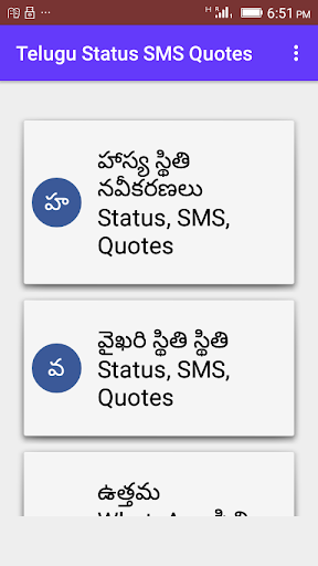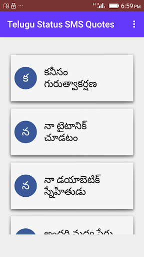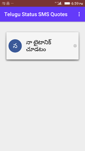 This app contains Telugu Language Status Messages for Social Media Apps. Keep updating your status on famous social apps with the help of this app.