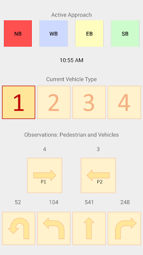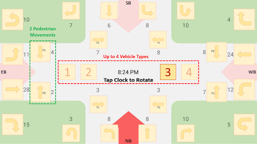 Turn your device into a virtual traffic count board capable of logging up to 4 vehicles and 2 pedestrian movements per approach on up to four approaches. Up to 4 vehicle classifications are possible. Data from the app is exported as a TDL file which can be analyzed for FREE with two different tools: a web-based one (http://tdlreport.portablestudies.com) and a stand-alone one for Windows computers available from http://www.portablestudies.com.