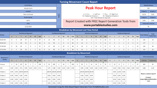 Both analysis tools produce reports in Excel (XLSX) format and include a summary of the peak hour, vehicle types by movement and approach, etc. Both analysis tools also provide access to the full count data.