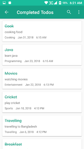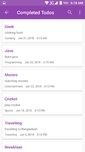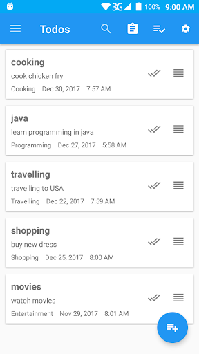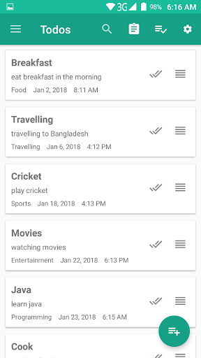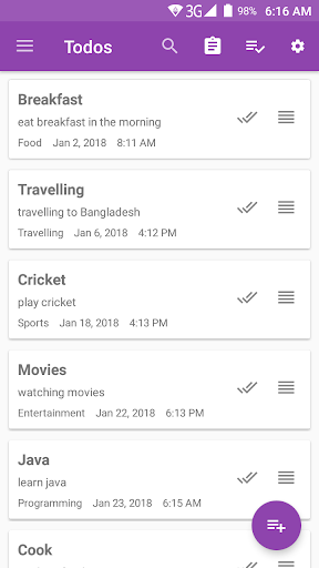 SQLite Simple Todo App is a task manager app for daily tasks.As a simple todo list it does almost all the basic staffs. This app is built on Material Design for great user experience.