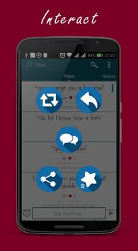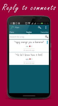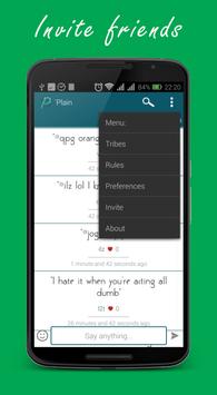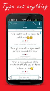 'Plain lets you say anything anonymously, read what other people are thinking, chat and create groups with them. That's it, no signups, none of your data required, just do you.