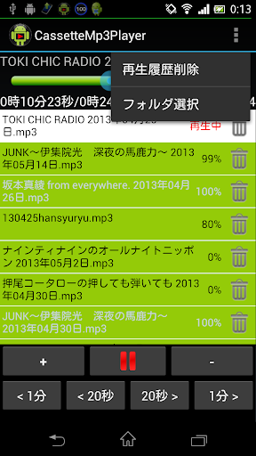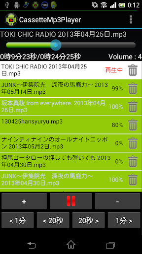 ファイル単位で再生を停止したポジションを保持する音楽プレイヤーです。 録音したラジオ番組など再生時間の長いファイルを聴く人におすすめ。 ・対応フォーマット MP3、AAC、WAV形式に対応しています。 ファイルのビットレートによっては再生されない場合があります。 ・機能 再生対象フォルダの指定。(サブフォルダのファイルも対象になります。) プレイリストの並べ替え。 不要になったファイルの削除。 イヤホンが抜けた場合に再生停止。 など