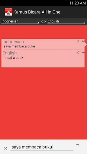 * Text to speech (tekan di tombol Speaker untuk mendengarkan hasil translasi kata ataupun kalimat)