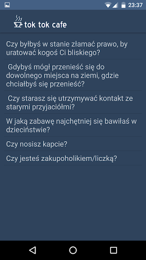Zbiór kilkuset ważnych, intrygujących a czasem błahych pytań, które możesz wykorzystać wybierając się na randkę lub na spotkanie ze znajomymi. Wylosuj pytanie, które chcesz zadać sobie lub innej osobie. Sprawdź czy wiesz wszystko o swoim partnerze lub znajomym. Najciekawsze z nich zapisz w swojej playliście.