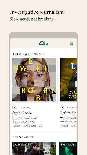 Get our weekly podcast, the Slow Newscast, every week in the members’ app. There’s also the Editor’s Voicemail – our co-founder James Harding’s take on the week just gone. Past podcast series include Sweet Bobby, Left to Die and Hidden Homicides.