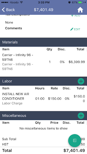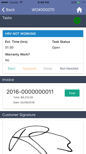 Tract Mobile uses work order details to create invoices and minimize the data entry that a field worker must perform. Field workers can make their final edits to the invoice and let Tract calculate the correct pricing based on parts, labour, and discounts. Once the invoice is ready, the customer can review, sign, pay, and then have a copy emailed to their inbox.