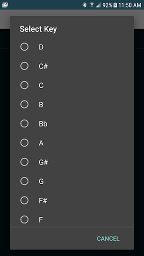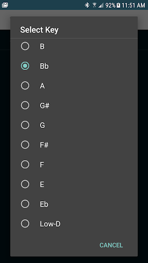 Touch the "i" to bring up the key selector. You may pick any key from Low-D to High-D in half-step intervals.