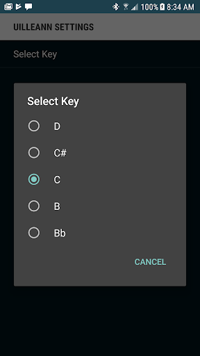 Uilleann now plays in all the most common keys: D, C#, C, B, and Bb. Touch the "i" to bring up the key selector.