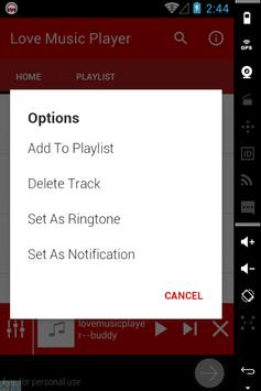 Love Music Player Feature : - Read all music track file from your internal/external storage - Create/Add Playlist - Set Ringtone - Delete Track - Set as Notification