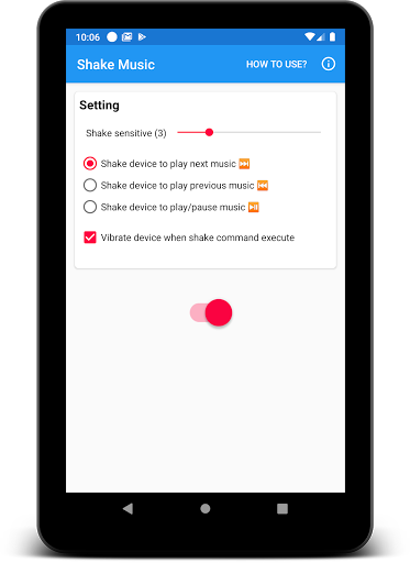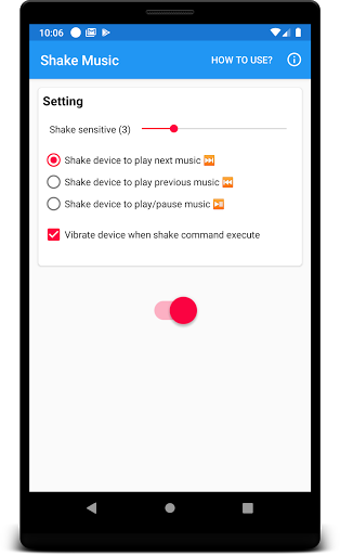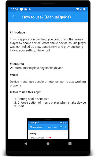 This is application can help you control another music player by shake device. After shake device, music player was controlled as play, pause, next and previous song follow your setting. Have fun!