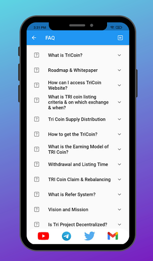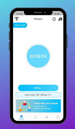 TRI Coin is a native token that is developed upon Binance Smart Chain BSC(BEP20) to support the infrastructure or ecosystem of project future developments & funding. The total supply is 1,00,000 tokens. It has 18 decimal fractions that are known as "TRI POINTS". In-app you will be mining POINTS which will re-balance & will be converted to Coins when withdrawals open.