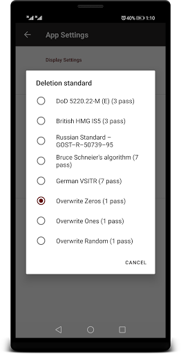 Data Shredder Android Eraser is not only made in Germany - a country with the highest data protection standards and laws. The app comes with secure erasing methods such as the British HMG IS5 standard, the German BSI-2011- VS and German BSI TL-03423, DoD 5220.22-M