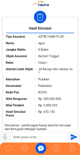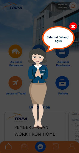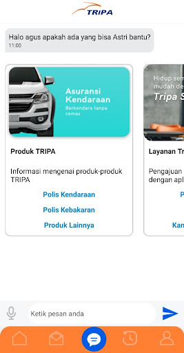 Triver "Astri" (Tripa အာမခံ) နှင့်အတူ Tripa Smart သည် PT Asuransi Tri Pakarta မှသင့်အားပေးနိုင်သည့် virtual classants ပုံစံဖြင့်တပ်ဆင်ထားသော PT Asuransi Tri Pakarta မှတုန့်ပြန်မှုနှင့်ပေါင်းစပ်ထားသောမိုဘိုင်း application solution (SMART) ဖြစ်သည် အကောင်းဆုံးဝန်ဆောင်မှု။ Tripa Smart သည်မည်သည့်အာမခံ 0 န်ဆောင်မှုလိုအပ်ချက်ကိုမဆို 0 န်ဆောင်မှုခံယူသူများအတွက်ဒီဂျစ်တယ်အလိုအလျောက်ပလက်ဖောင်းဖြင့်မည်သည့်အာမခံဝန်ဆောင်မှုလိုအပ်ချက်ကိုမဆိုအဖြေရှာသည့်အယူအဆကို 0 န်ဆောင်မှုပေးသည်။ ၎င်းသည်ကုမ္ပဏီ၏ဆောင်ပုဒ်နှင့်အညီ "အကောင်းဆုံးပေး" နေသောကုမ္ပဏီ၏ဆောင်ပုဒ်နှင့်အညီဖြစ်သည်။