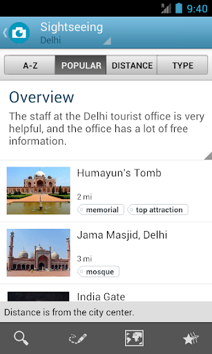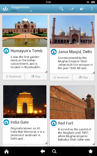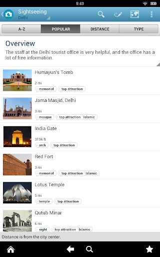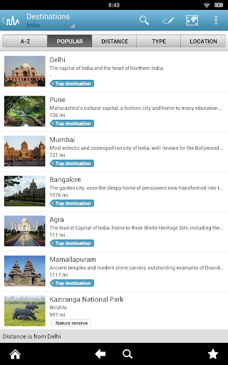 The India travel guide contains complete and up to date city guides for Delhi, Udaipur, Agra, Mamallapuram and many other travel destinations in India. It works offline, you don't need an internet connection.