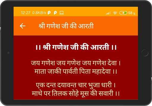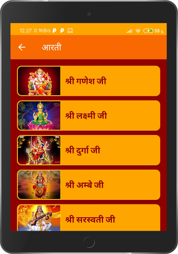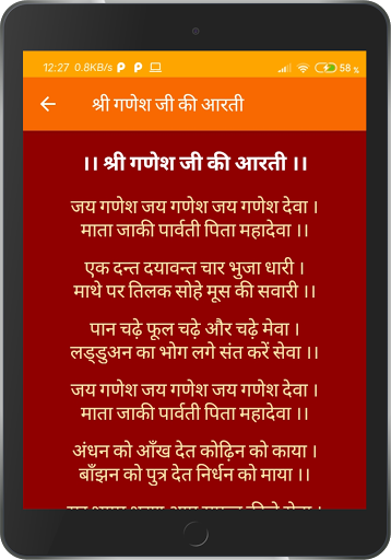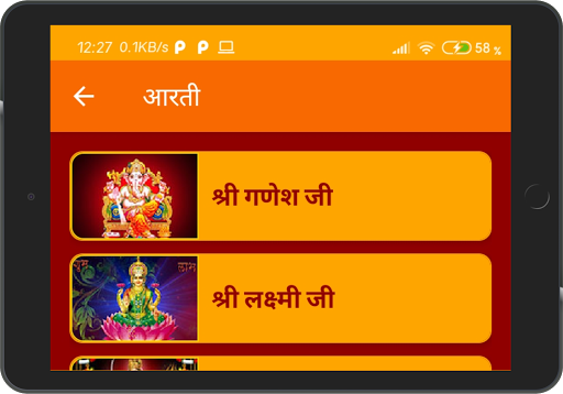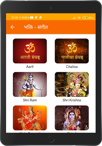 Aarti: Lord Ganesh Aarti, Maa Lakshmi Aarti, Maa Durga Aarti, Maa Ambe Aarti, Maa Sarswati Aarti, Maa Tulsi Ji Aarti, Maa Ganga Aarti, Maa Gaytri Aarti, Lord Satyanarayan Aarti, Lord Vishnu Aarti, Lord Ram Aarti, Ramayan Aarti, Lord Shiv Aarti, Lord Hanuman Aarti, Lord Shani Dev Aarti, Lord Kunj Bihari Aarti, Lord Vrihaspati Dev Aarti, Maa Vaishno Aarti, Lord Surya Dev Aarti, Lord Vishwkarma Aarti, Maa Kali Aarti and Shri Saibaba Aarti.