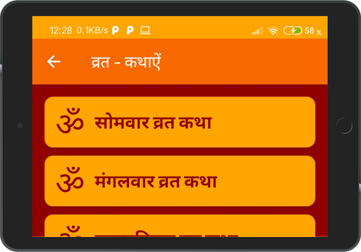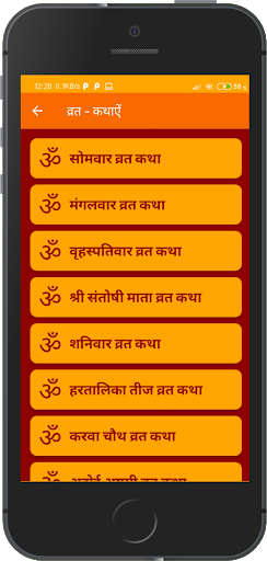 Vrat Katha: Somwar Vrat Katha, Mangalwar Vrat Katha, Vrihaspatiwar Vrat Katha, Santoshi Mata Vrat Katha, Shaniwar Vrat Katha, Hartalika Teej Vrat Katha, Karwa Chauth Vrat Katha, Ahoi Ashtami Vrat Katha and Chhath Vrat Katha.