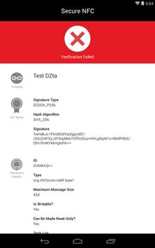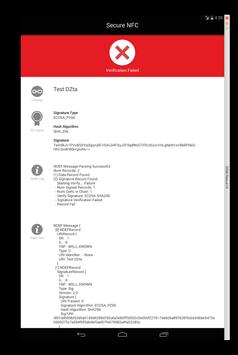 If a scanned tag contains a Signature Record, the Secure NFC reader/verifier will verify the data in the message and display the details of the Signature record, including: