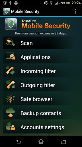 TrustPort Mobile Security offers you not only the function of scanning your phone on demand, but it also offers a resident shield – on access scanning, as main protection against malware. The application enables you to surf the web safely, because it scans the URL addresses that you