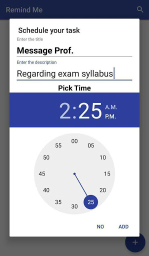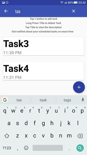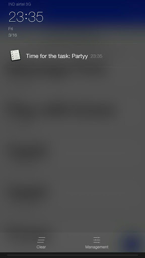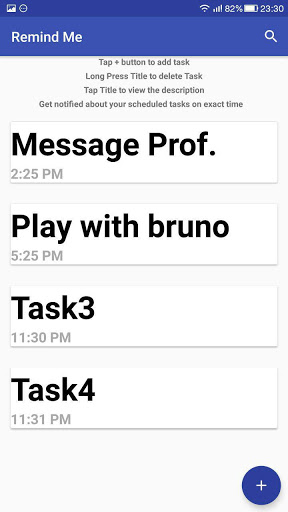 Press the button to add the task and set the reminder time. The system will send you notification about your scheduled task on exact time.To clear up the task ,long press the title of the task and it will be removed , use the search view feature to filter your past , current and future tasks.Also , you can tap the task title to see its description.