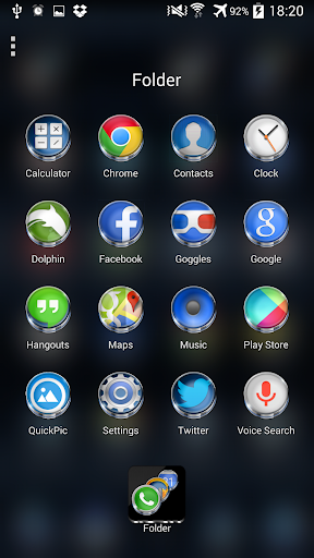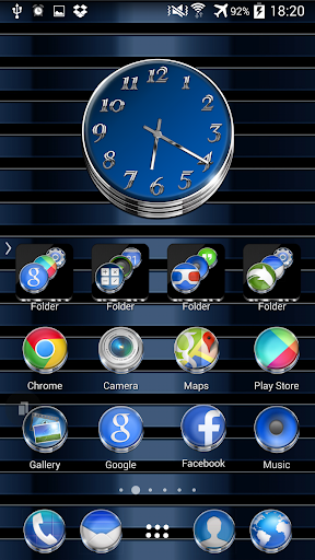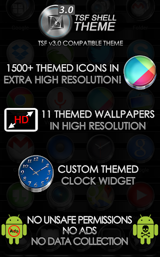 TSF launcher theme compatible with latest TSF Shell version. Extremely detailed and high quality elegant and modern TSF Shell theme with high definition graphics including a 1500 pack of HD icons, 11 custom themed HD wallpapers, and a metal clock widget, to give very detailed and defined graphics even in devices with the highest resolution screens. Everything is themed to the last detail, using metallic textures, lighting effects, reflections and gradients to give a great contrast and quality look.