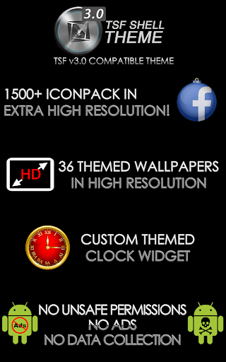 Extremely detailed and high quality TSF Shell theme with high definition graphics, all icons are themed through multiple layer masking, includes 26 themed HD wallpapers (plus 18 more off-focus versions) and includes a themed clock widget, all in HD to give very detailed and defined graphics even in devices with the highest resolution screens.