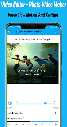 * Slow motion video maker allows you to set the speed of your video to 0.5X, 0.7X, 1x,2.5x,1.5X, 2X, 3X, 4X,5x,6x,And 7x.