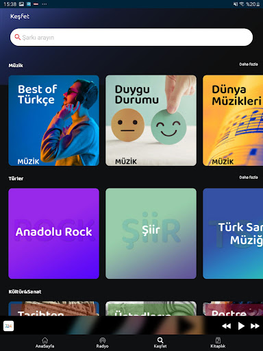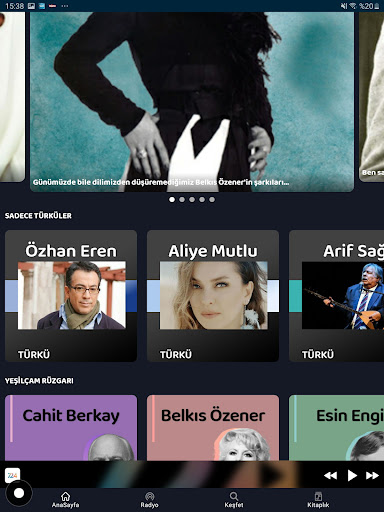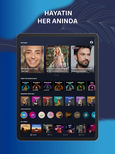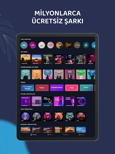 موسيقى مجانية: Pop، Rock، Anadolu موسيقى الروك، العربية، الموسيقى الفنية التركية، الموسيقى الكلاسيكية، Türki أو الموسيقى البديلة ... موسيقى وفقا للنمط الآن مجانا مجانا وأنت مستعد لك قوائم التشغيل المحضرة الخاصة بك. يمكنك تتبع المغني المفضل لديك، يمكنك سرد الأغاني المفضلة لديك.