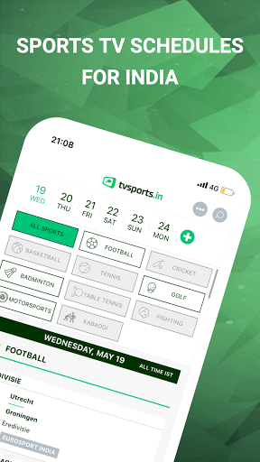 TVsports.in gathers all televised and streamed games from Indian TV channels and streaming services. The app covers Cricket, Kabaddi, Football, Basketball, Tennis, Golf, Badminton, Table tennis, Fighting and Motorsports.
