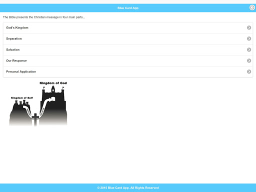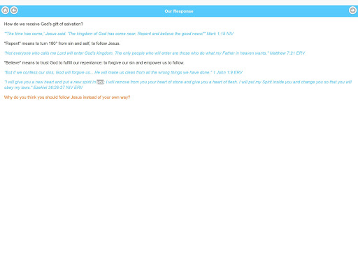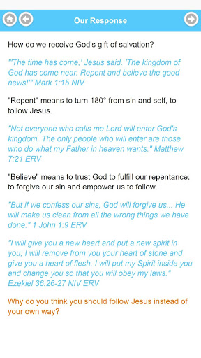 The Blue Card helps you present the Christian message to someone, and gives them an opportunity to respond. You read the black sentences, they read the blue Bible verses, and then you ask them the orange questions.
