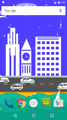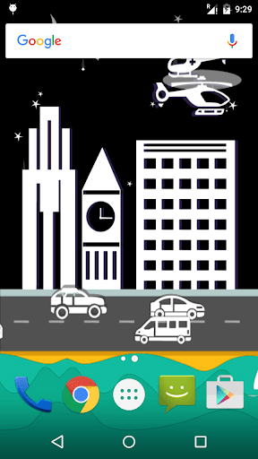 Night City Live Wallpaper, cars, dark, dust and dawn background with falling stars, flying helicopters and calmness of sea waves. Inspired by the city life on the shore of beautiful sea. Change the theme colors in the settings, Increase or decrease speed of cars and chopper in the settings.