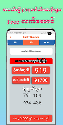 2D Myanmar include : - Daily 2D Real-time Results - 2D Results and History - 3D Results and History - Thai Lottery - Daily Weekly Lucky Number - Live Chat Terms: All data provided in this app are for educational and personal use only.