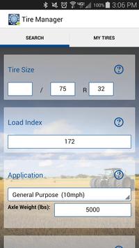 Tire Manager (by Titan and Goodyear Farm Tires®) allows growers and tire technicians the ability to calculate optimum tire inflation pressure for agricultural equipment by simply entering tire size, application, axle weight and specifying singles or duals. The calculator works for any brand of metric, agricultural radial tire. The app features a quick-search tire finder function and allows users to save commonly accessed tires to their list of favorites. Favorite tires can then be accessed without an Internet connection, and inflation pressures can be easily recalculated whenever adjustments to application or axle weight are made. Tire Manager eliminates the need to carry around extensive load/inflation table data, and helps growers ensure their tires are properly inflated for optimum performance and durability.