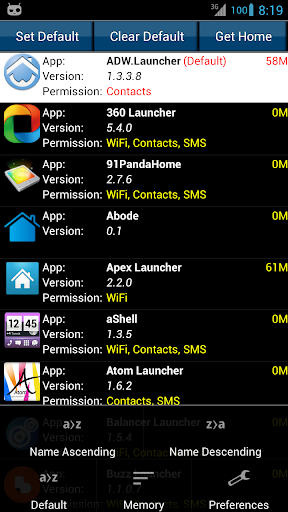 Get Home: This action will bring up a dialog to select Home Apps that are on the Android Market. By making a selection it will take you to the Home App selected on the Android Market. This way it makes it easy for you to try out some different Home Apps.