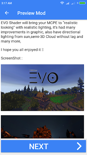 EVO Shader will bring your MCPE to “realistic looking” with realistic lighting, it’s had many improvements in graphic, also have directional lighting from sun,semi-3D Cloud without lag and many more,