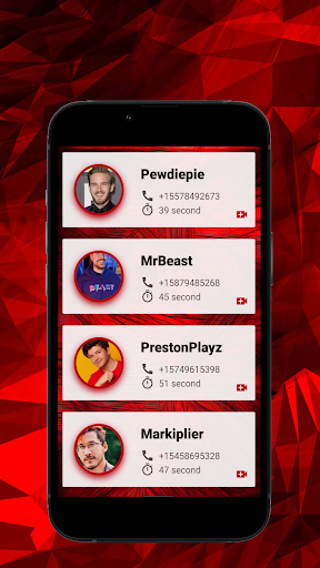 Youtubers Fake Video Call is an app that generates prank video calls similar to WhatsApp/Facebook live calls but simulated with your favorite celebrities and idols like MrBeast, Pewdiepie, PrestonPlayz and Markiplier. It is an imitation call designed to accompany your days in your spare time, stop you from feeling lonely and bored and helps you get closer to your idol. The app is Made for fun purposes only.