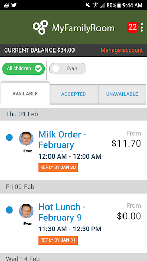 · Approve and pay for a school event with just a few taps on your handheld device through the convenience of the My Family Room mobile app.