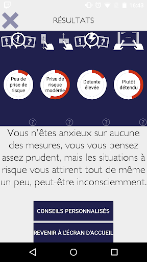 Casse-cou est une application qui permet de tester la propension au risque et le niveau d’anxiété de manière implicite et explicite chez une personne. Toutefois, les résultats et les conseils qui vous seront donnés en utilisant Casse-cou sont limités et seul un professionnel, médecin ou psychologue peut les interpréter pleinement. De plus, les résultats à ce test n'auront aucune validité si vous ne le réalisez pas sérieusement ou si vous le réalisez dans un environnement bruyant ou distrayant.